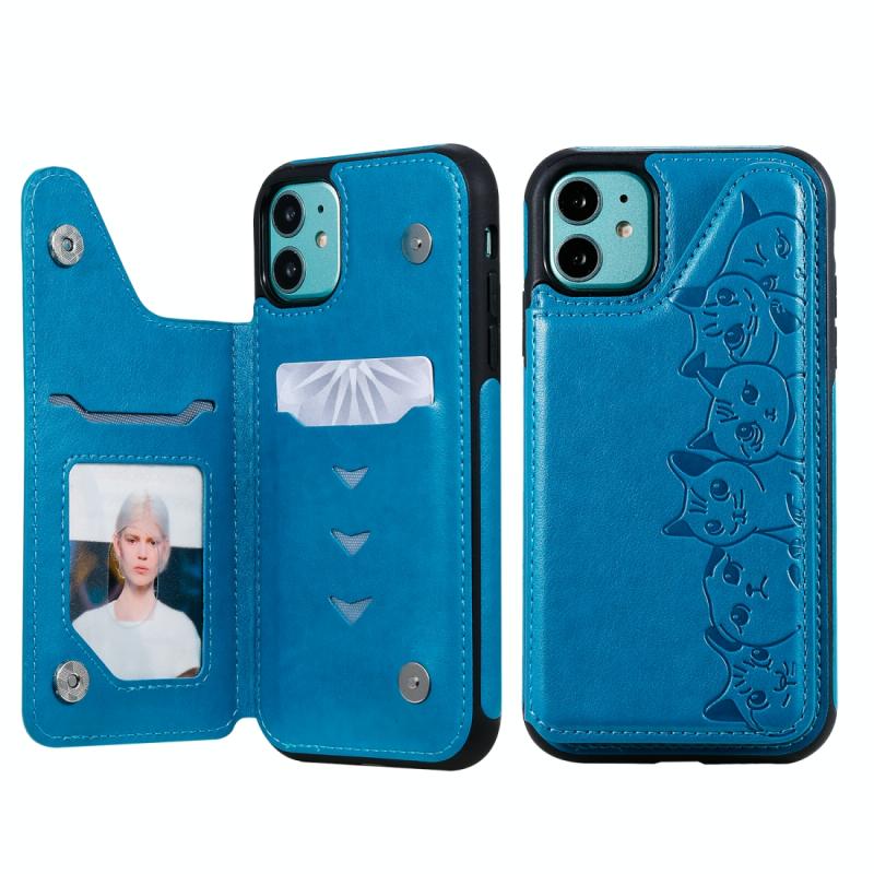 For iPhone 11 Six Cats Embossing Pattern Protective Case with Holder & Card Slots & Photo Frame(Blue)