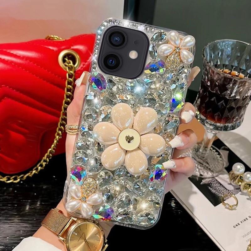 For iPhone 11 Sunflower Holder Hand-set Diamond PC Phone Case(White)