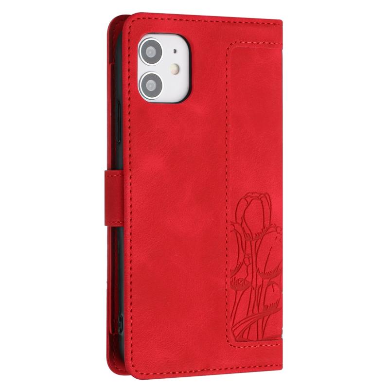 For iPhone 11 Tulips Embossed Leather Phone Case with Lanyard(Red)