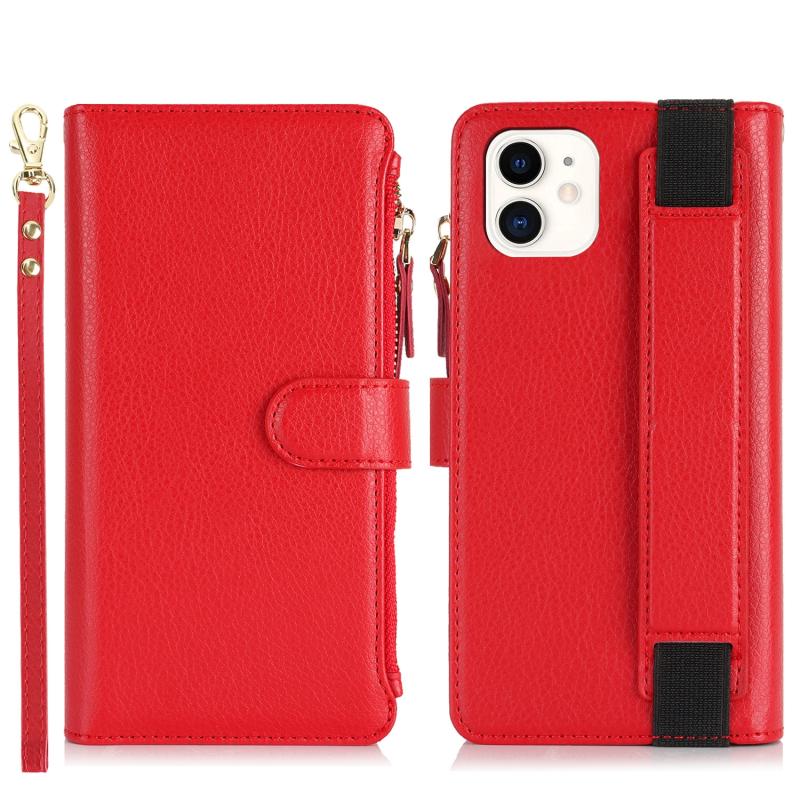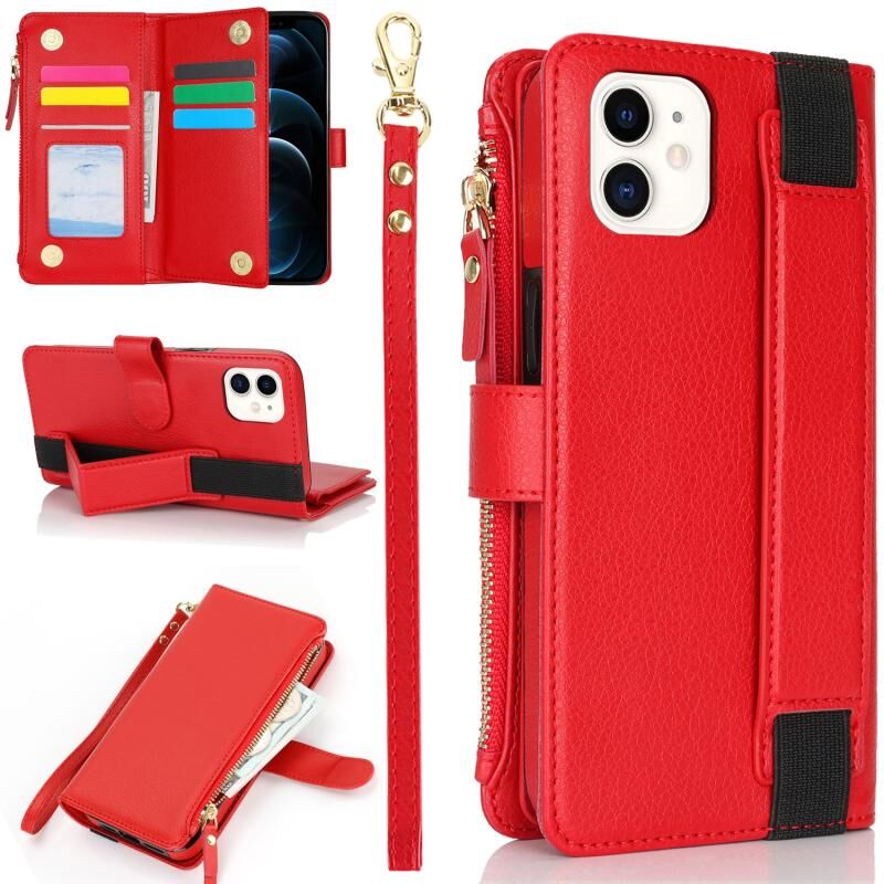 For iPhone 11 Wristband Holder Zipper Purse RFID Leather Phone Case(Red)