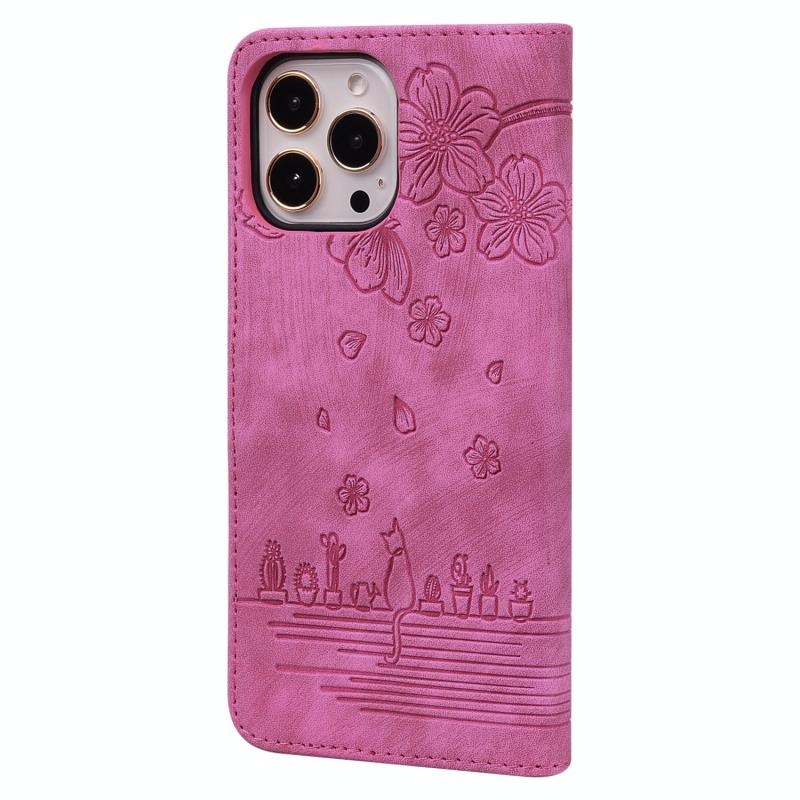 For iPhone 12 / 12 Pro Cartoon Sakura Cat Embossed Leather Case(Rose Red)