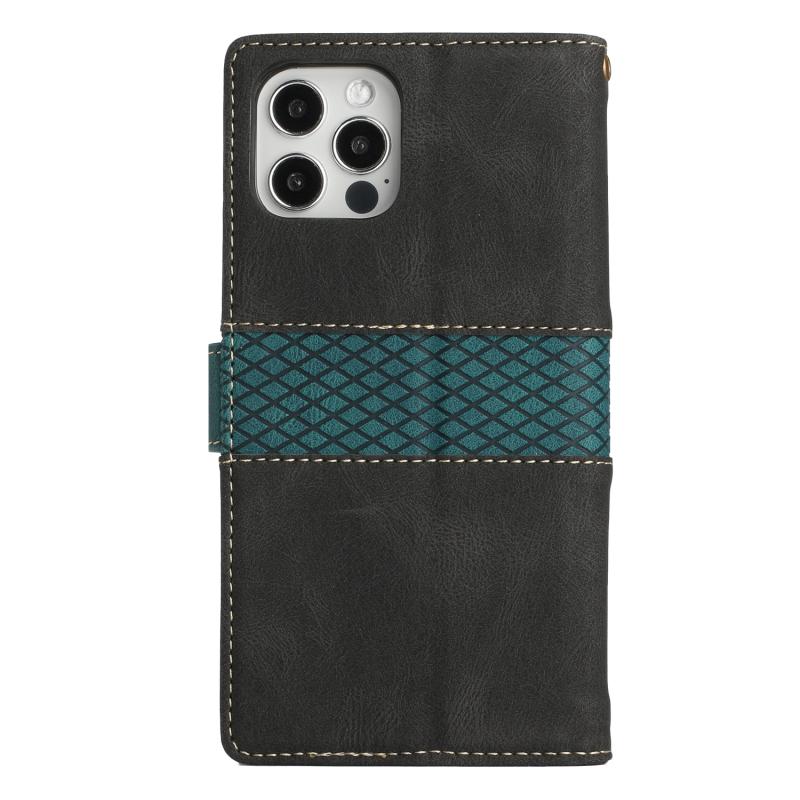 For iPhone 12 / 12 Pro Grid Stitching Leather Phone Case with Lanyard(Black)