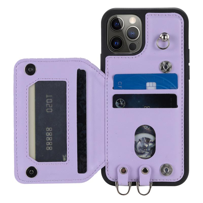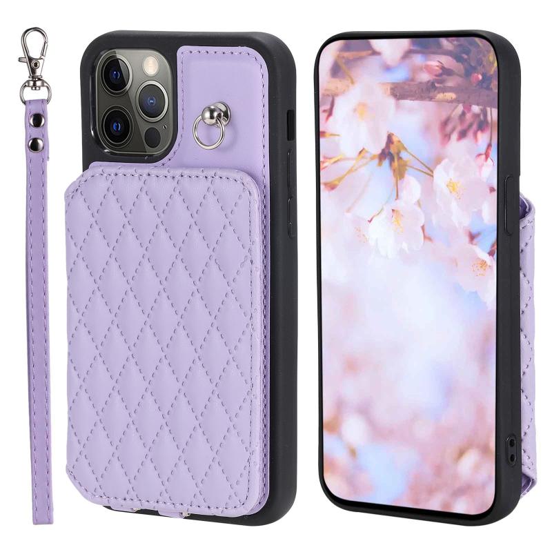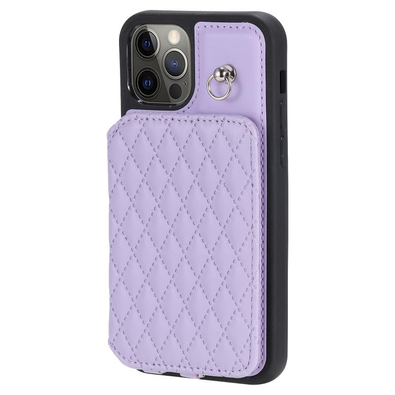 For iPhone 12 / 12 Pro Grid Texture Card Bag Phone Case with Lanyard(Purple)