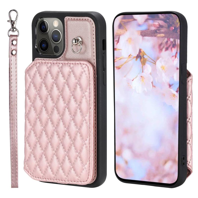 For iPhone 12 / 12 Pro Grid Texture Card Bag Phone Case with Lanyard(Rose Gold)
