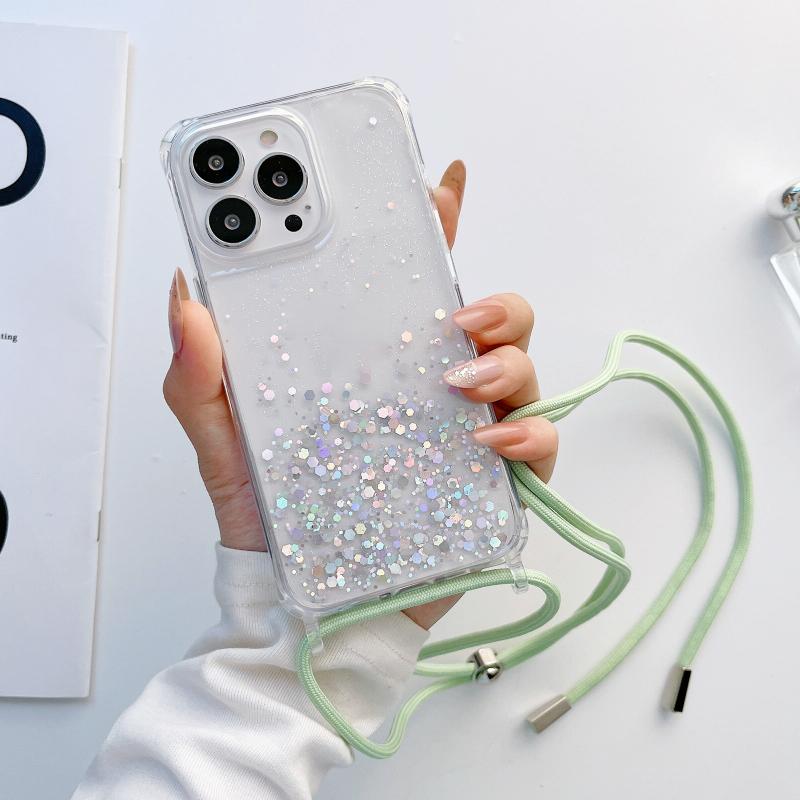 For iPhone 12 / 12 Pro Lanyard Glitter Epoxy Clear Phone Case(Green)