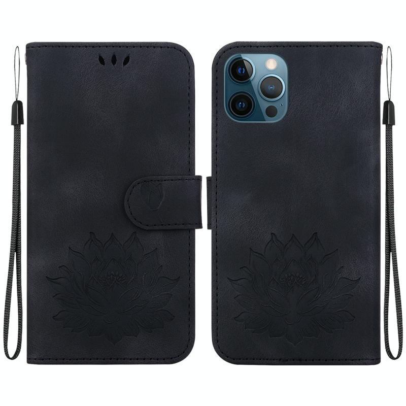 For iPhone 12 / 12 Pro Lotus Embossed Leather Phone Case(Black)