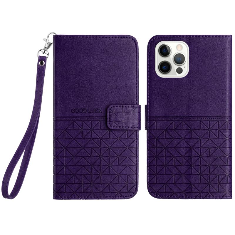 For iPhone 12 / 12 Pro Rhombic Texture Leather Phone Case with Lanyard(Purple)