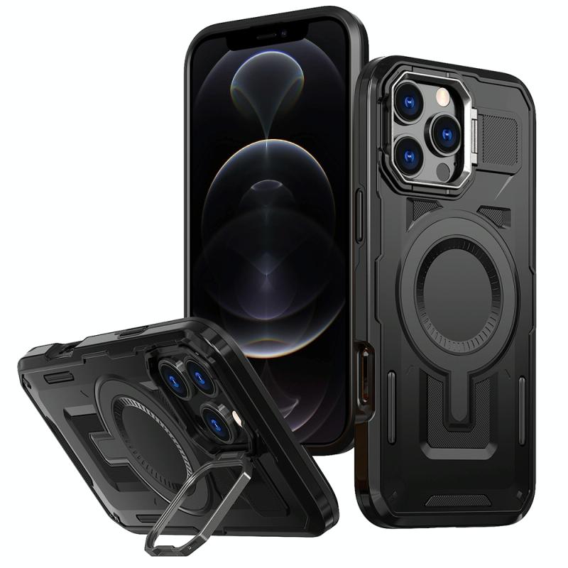 For iPhone 12 / 12 Pro Shield Hollow Frame Holder MagSafe Phone Case(Black)