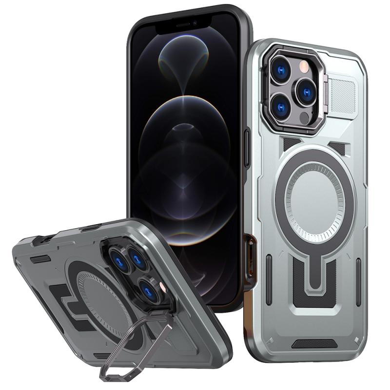 For iPhone 12 / 12 Pro Shield Hollow Frame Holder MagSafe Phone Case(Grey)