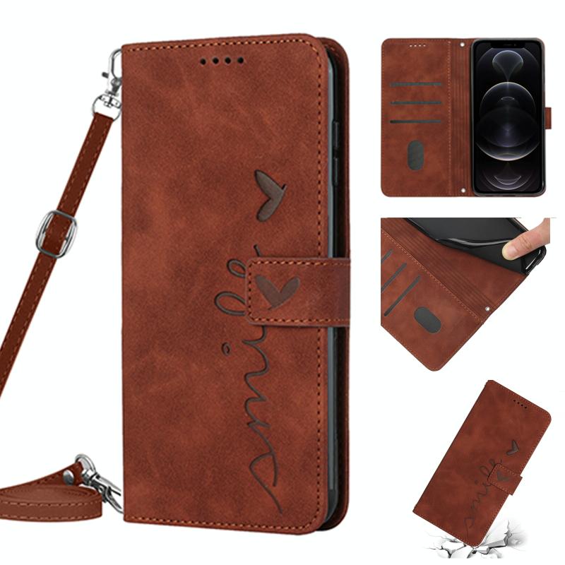 For iPhone 12 / 12 Pro Skin Feel Heart Pattern Leather Phone Case with Lanyard(Brown)