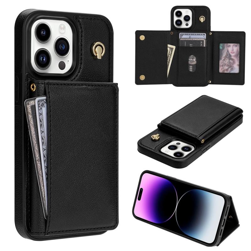 For iPhone 12 / 12 Pro Three Fold Card Bag Phone Case with Long Lanyard(Black)