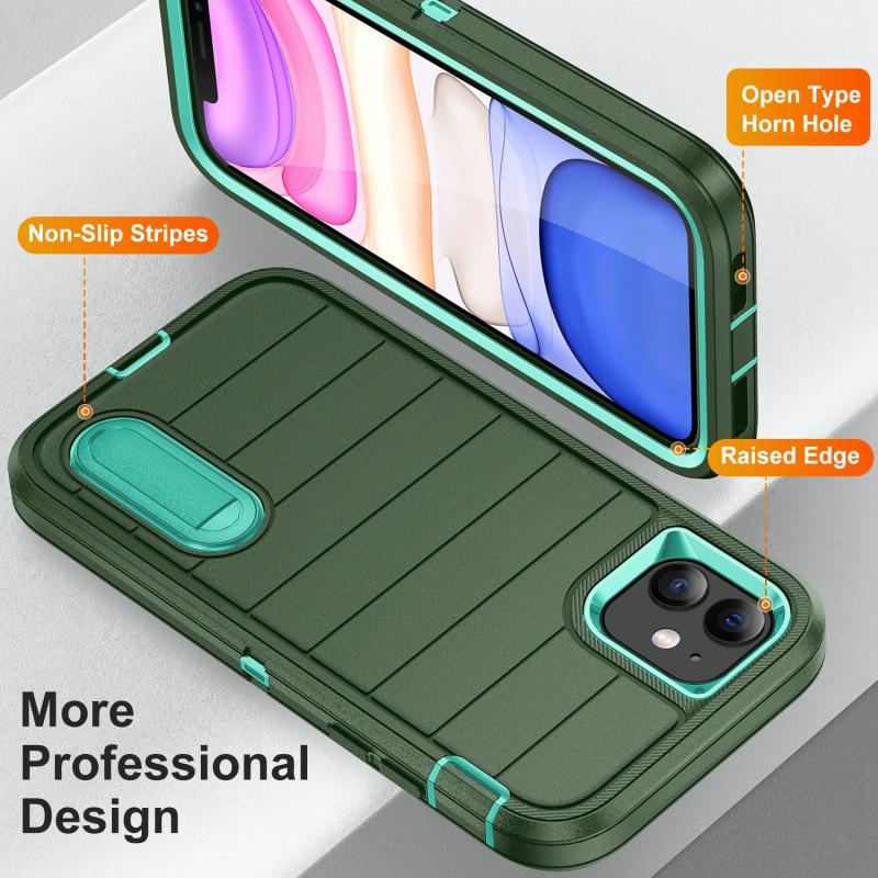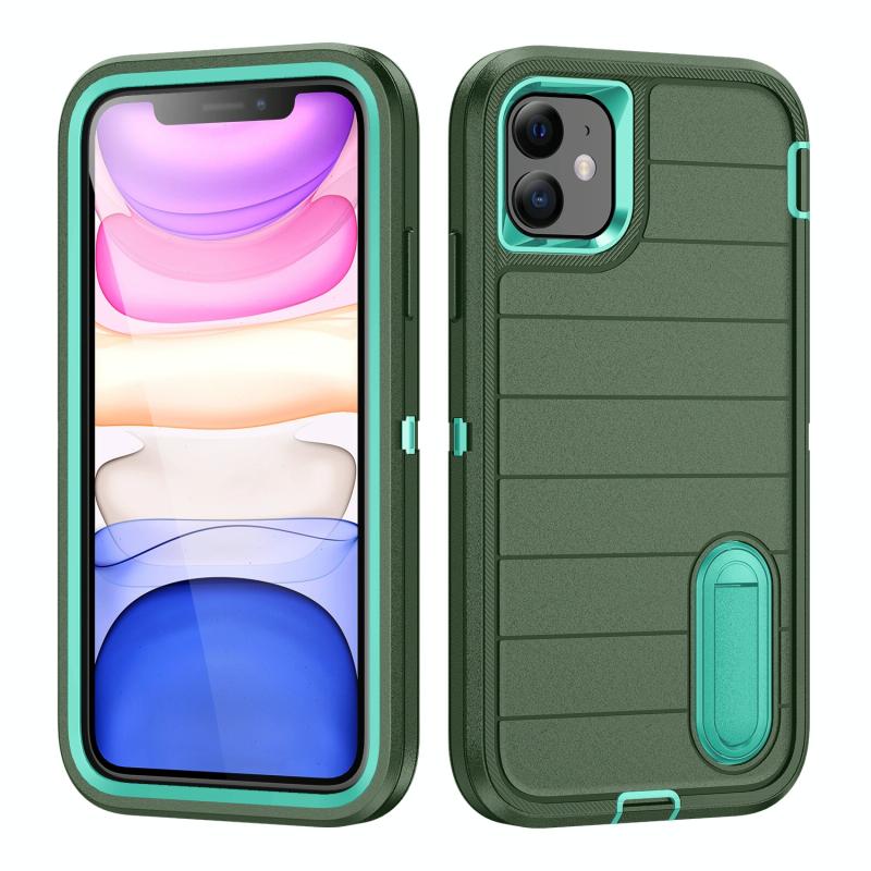 For iPhone 12 Defender Gen2 Rugged PC + Silicone Phone Case with Holder(Dark Green+Cyan)