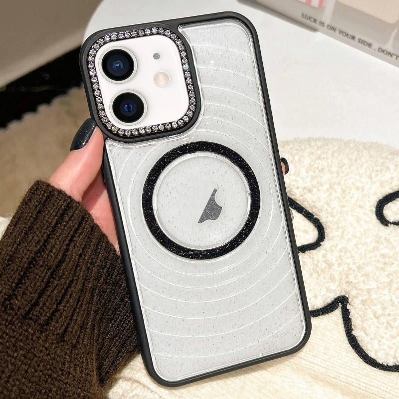 For iPhone 12 Diamond Lens Frame MagSafe Wave Texture Clear Phone Case(Black)