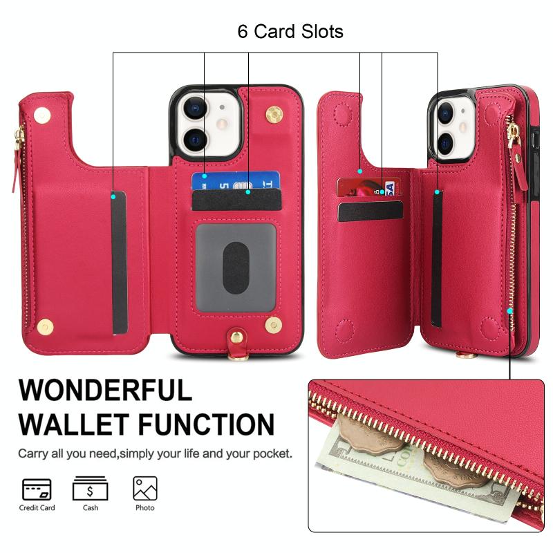 For iPhone 12 Double Flap Zipper RFID Leather Phone Case with Short Lanyard(Red)