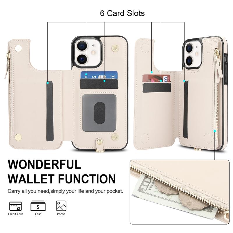 For iPhone 12 Double Flap Zipper RFID Leather Phone Case with Short Lanyard(White)