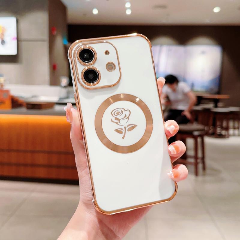For iPhone 12 Electroplate Side Roses Flower MagSafe Phone Case(White)
