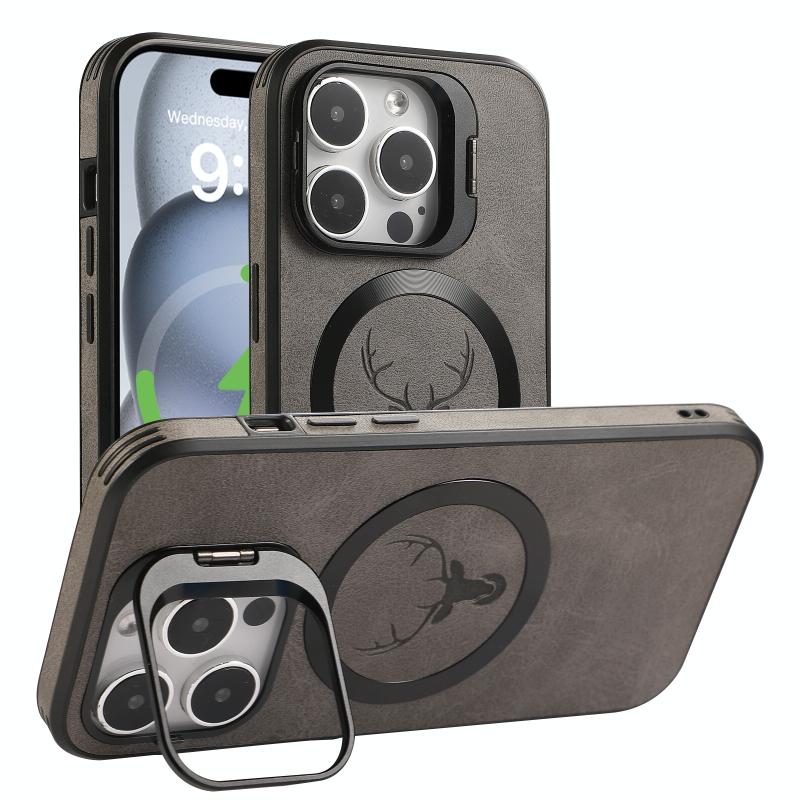For iPhone 12 Elk Lens Holder Magsafe Shockproof Phone Case(Grey)