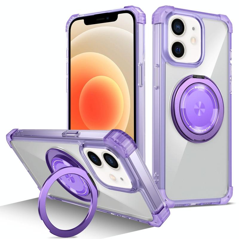For iPhone 12 Gold Shield CD Pattern MagSafe Magnetic Phone Case with Rotating Stand(Transparent Purple)