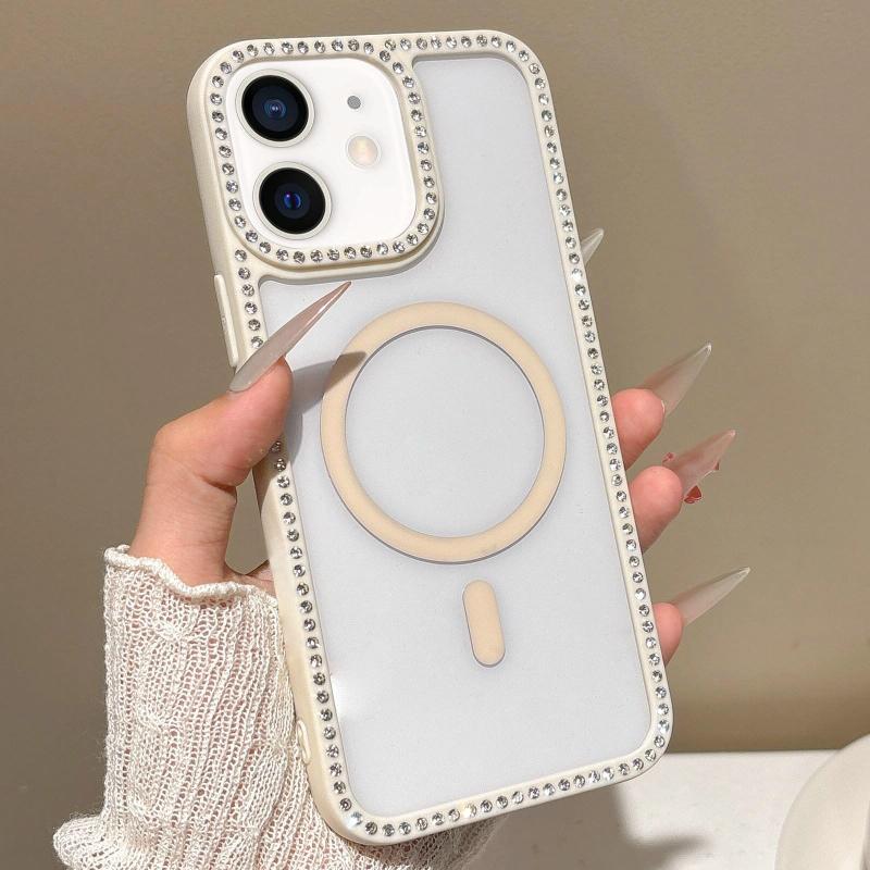 For iPhone 12 Large Lens Hole Rhinestone Frame MagSafe Phone Case(Beige)