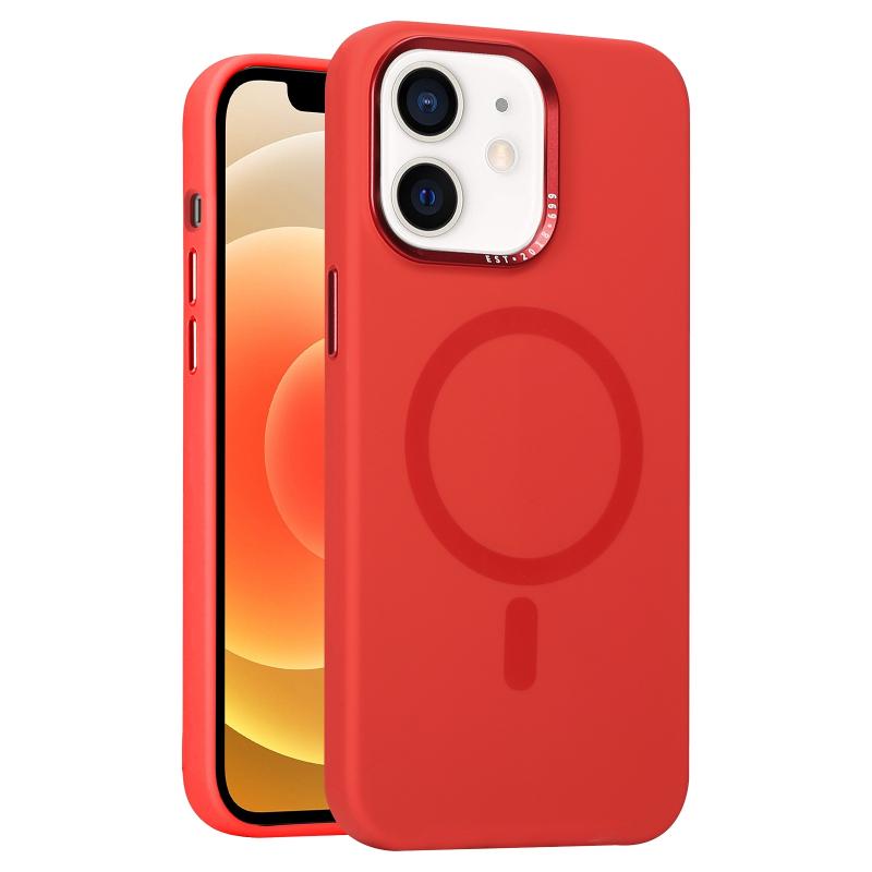 For iPhone 12 Metal Lens Frame Liquid Silicone MagSafe Phone Case(Red)
