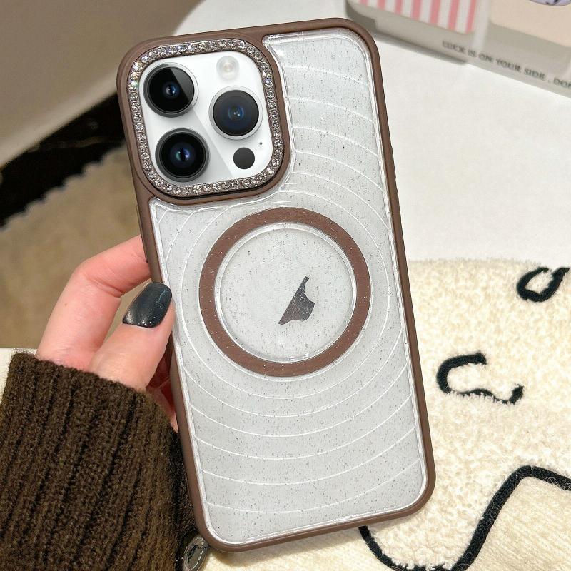 For iPhone 12 Pro Diamond Lens Frame MagSafe Wave Texture Clear Phone Case(Brown)