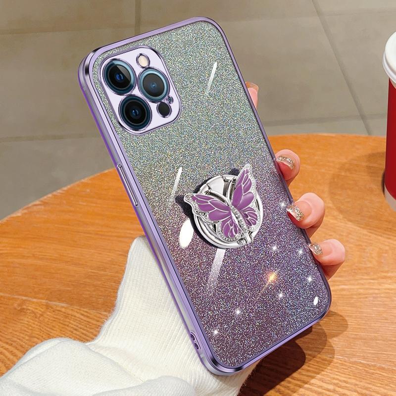 For iPhone 12 Pro Plated Gradient Glitter Butterfly Holder TPU Phone Case(Purple)