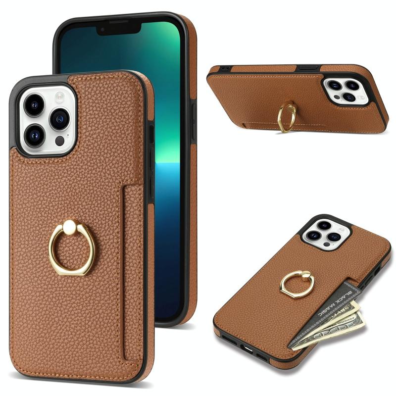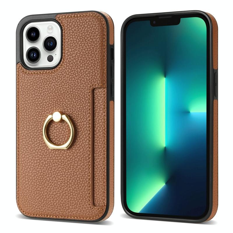For iPhone 12 Pro Ring Card Litchi Leather Back Phone Case(Brown)