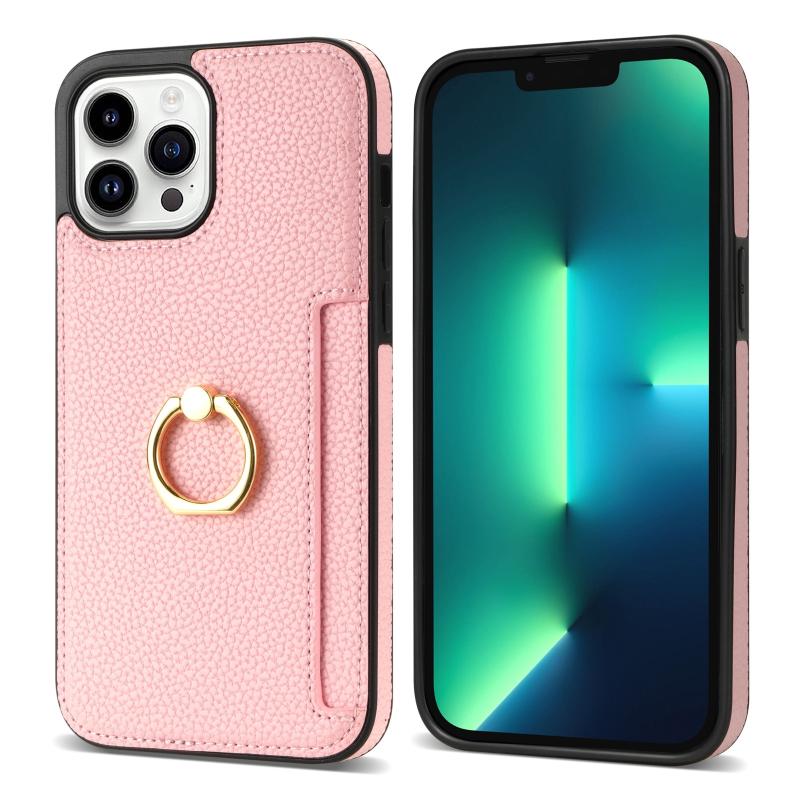 For iPhone 12 Pro Ring Card Litchi Leather Back Phone Case(Pink)