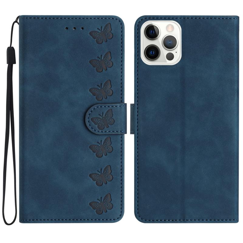 For iPhone 12 Pro Seven Butterflies Embossed Leather Phone Case(Blue)