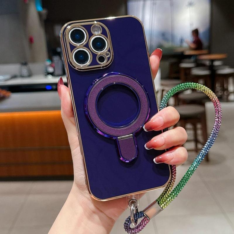 For iPhone 12 Pro Solid Color Electroplated Metal Holder Phone Case with Lanyard(Dark Purple)