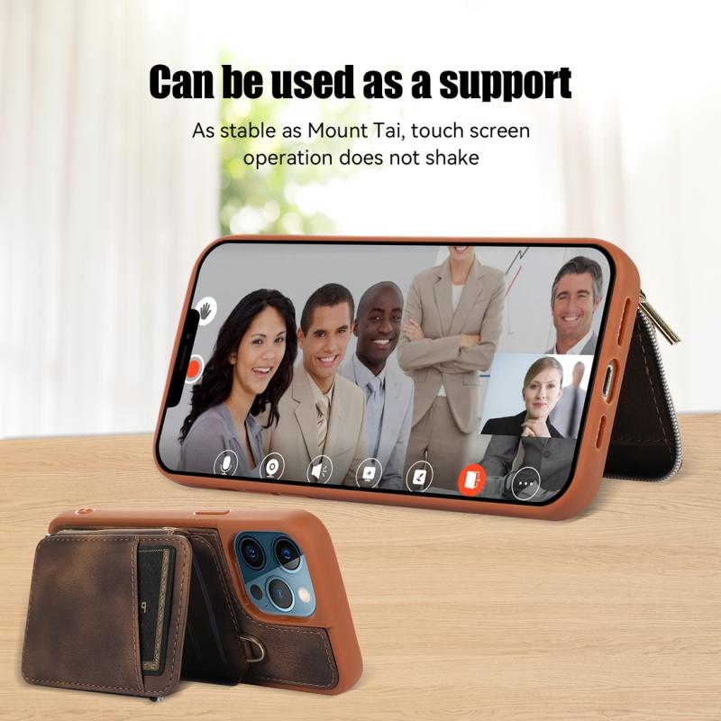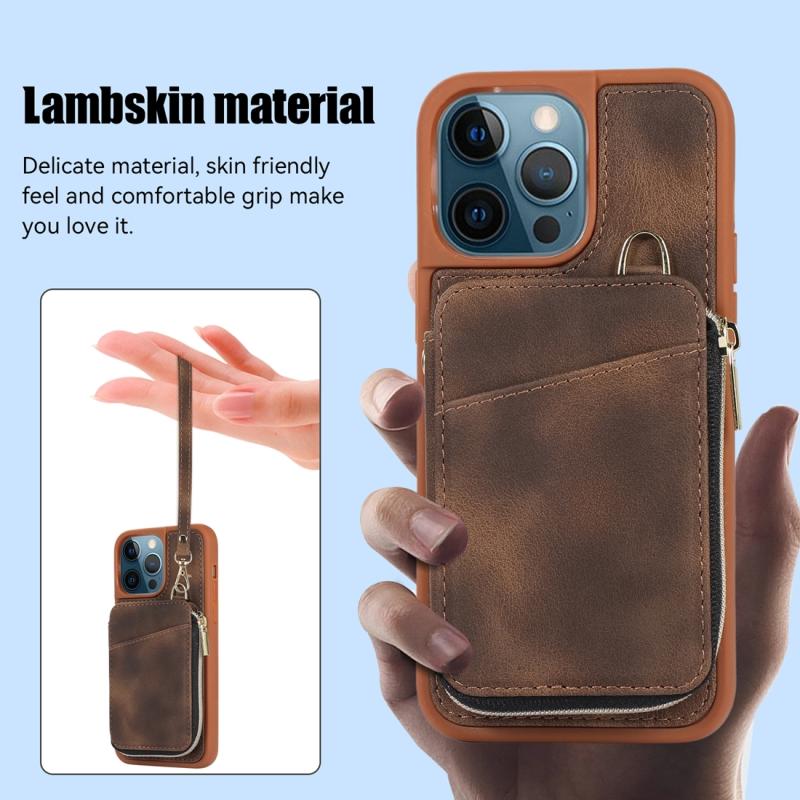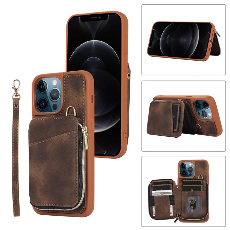 For iPhone 12 Pro Zipper Card Bag Back Cover Phone Case(Brown)