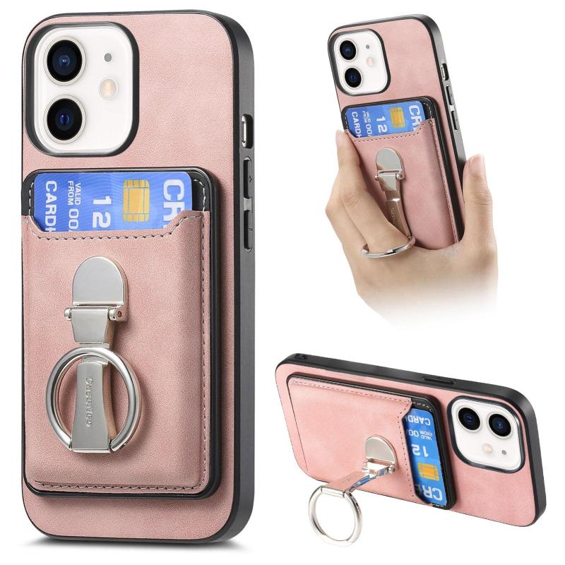 For iPhone 12 Retro Folding Ring Holder Card Bag MagSafe Phone Case(Pink)