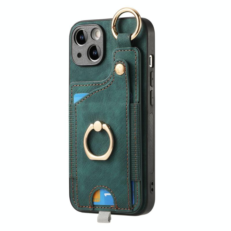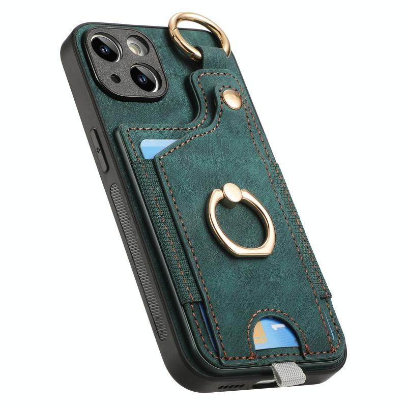 For iPhone 12 Retro Skin-feel Ring Card Bag Phone Case with Hang Loop(Green)