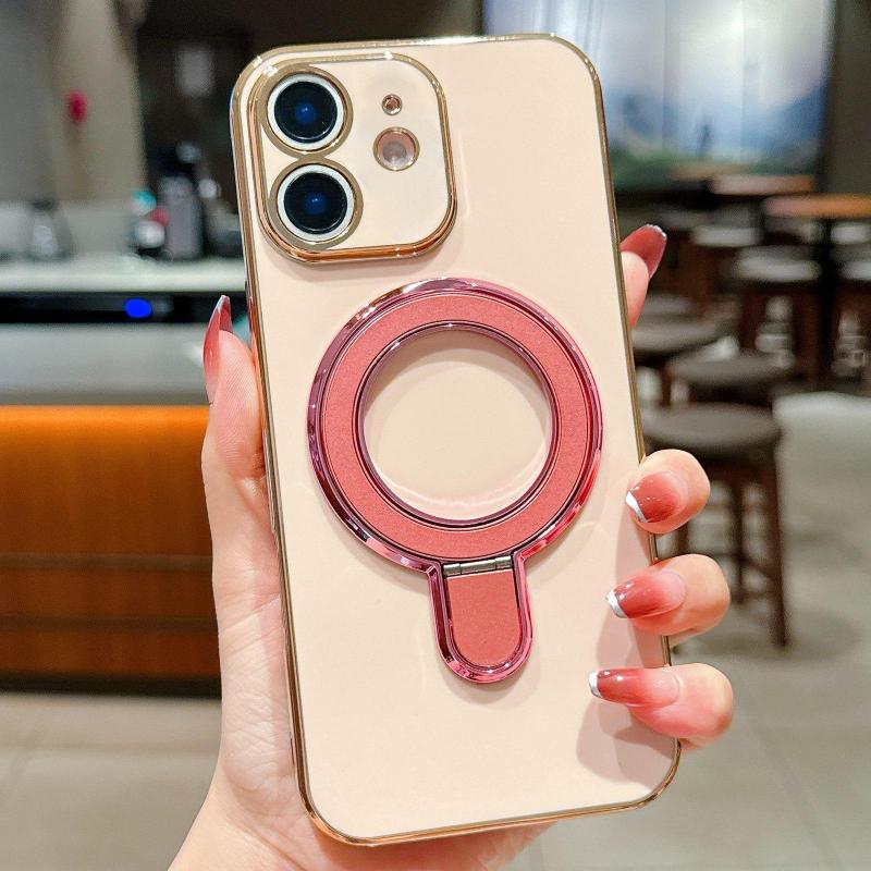 For iPhone 12 Solid Color Electroplated Metal Holder Phone Case(Rose Pink)