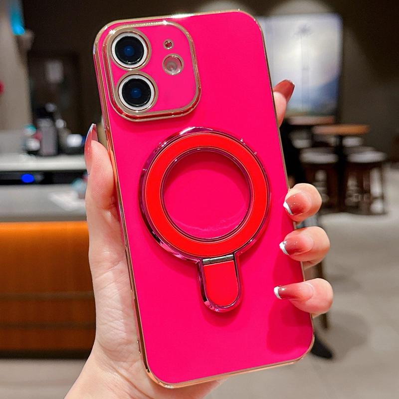 For iPhone 12 Solid Color Electroplated Metal Holder Phone Case(Rose Red)