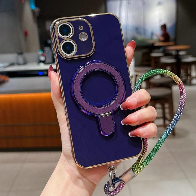 For iPhone 12 Solid Color Electroplated Metal Holder Phone Case with Lanyard(Dark Purple)