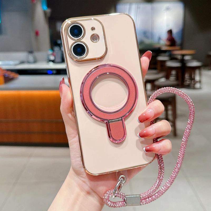 For iPhone 12 Solid Color Electroplated Metal Holder Phone Case with Lanyard(Rose Pink)