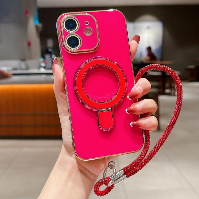 For iPhone 12 Solid Color Electroplated Metal Holder Phone Case with Lanyard(Rose Red)