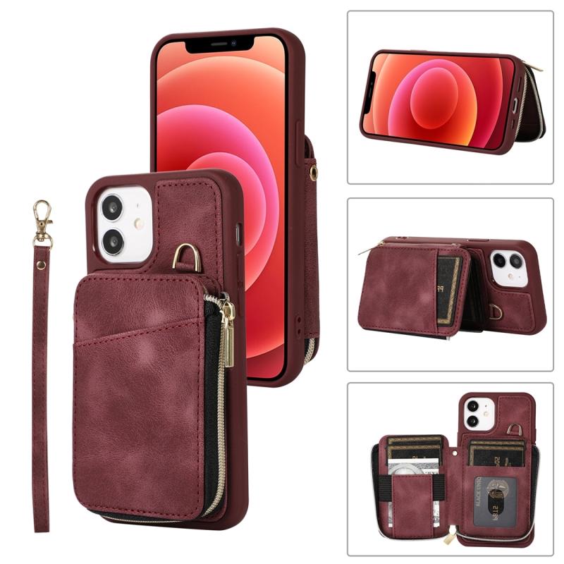 For iPhone 12 Zipper Card Bag Back Cover Phone Case(Wine Red)