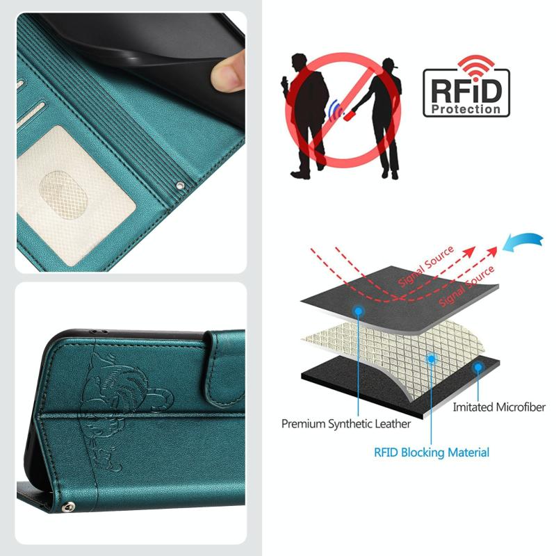 For iPhone 13 / 14 Cat Rat Embossed Pattern RFID PU Phone Case with Wrist Strap(Peacock Green)