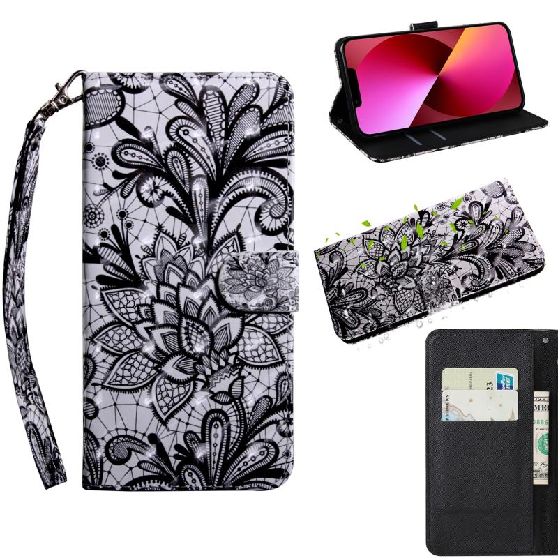 For iPhone 13 3D Painting Pattern Coloured Drawing Leather Phone Case(Black Lace)