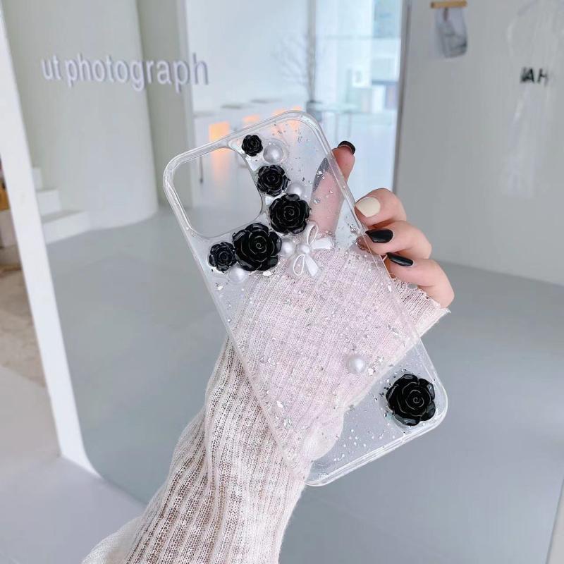 For iPhone 13 3D Pearl Bow Rose Glitter Epoxy TPU Phone Case(Black)