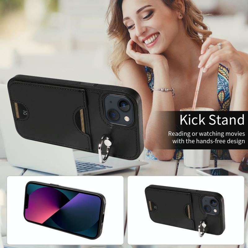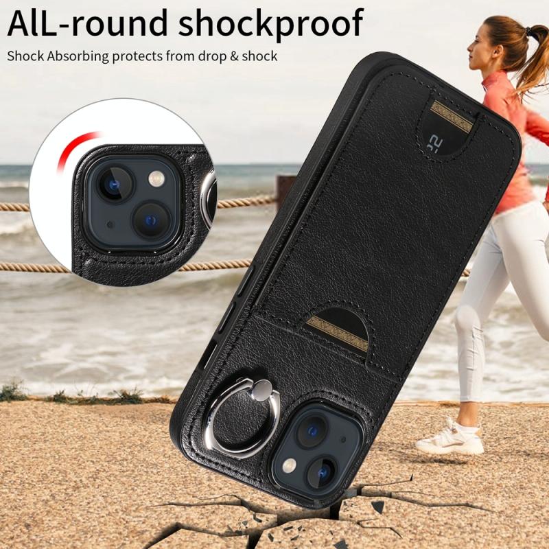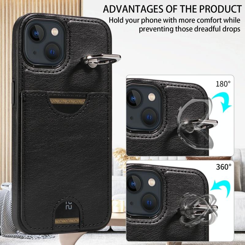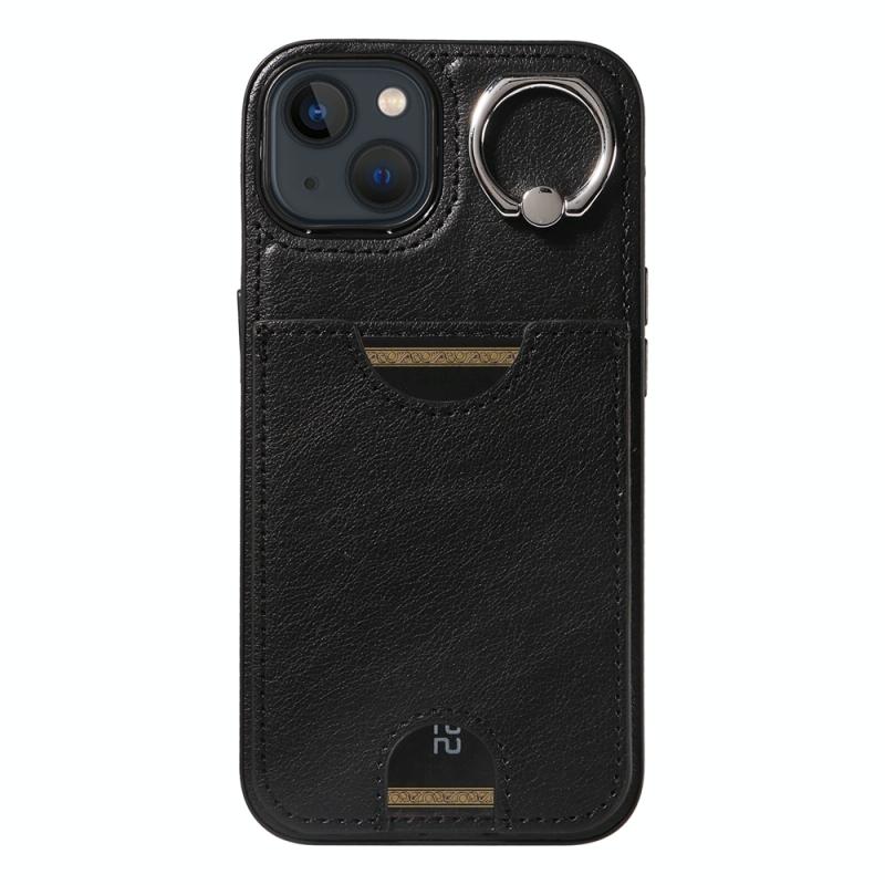 For iPhone 13 Calf Texture Card Slot Ring Holder Phone Case(Black)