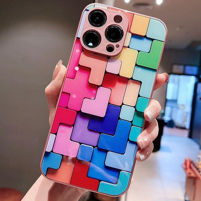 For iPhone 13 Colorful Toy Bricks Pattern Shockproof Glass Phone Case(Pink)