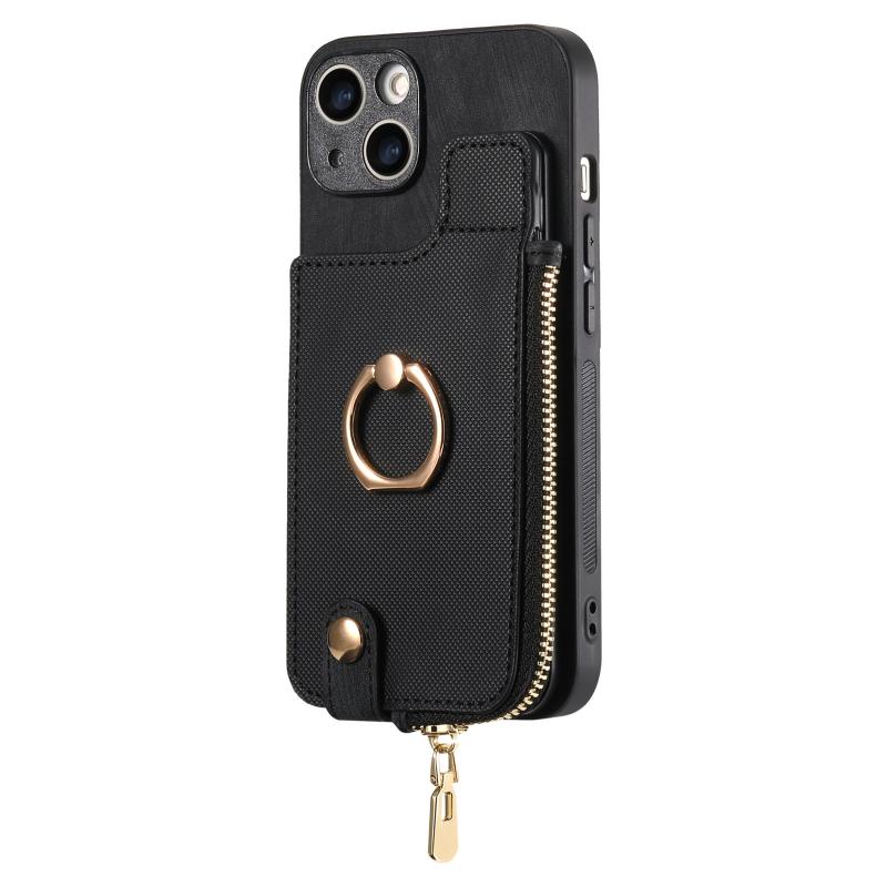 For iPhone 13 Cross Leather Ring Vertical Zipper Wallet Back Phone Case(Black)