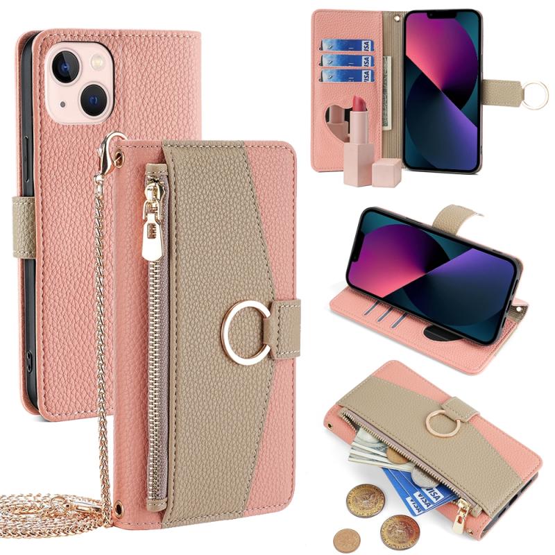 For iPhone 13 Crossbody Litchi Texture Leather Phone Case(Pink)