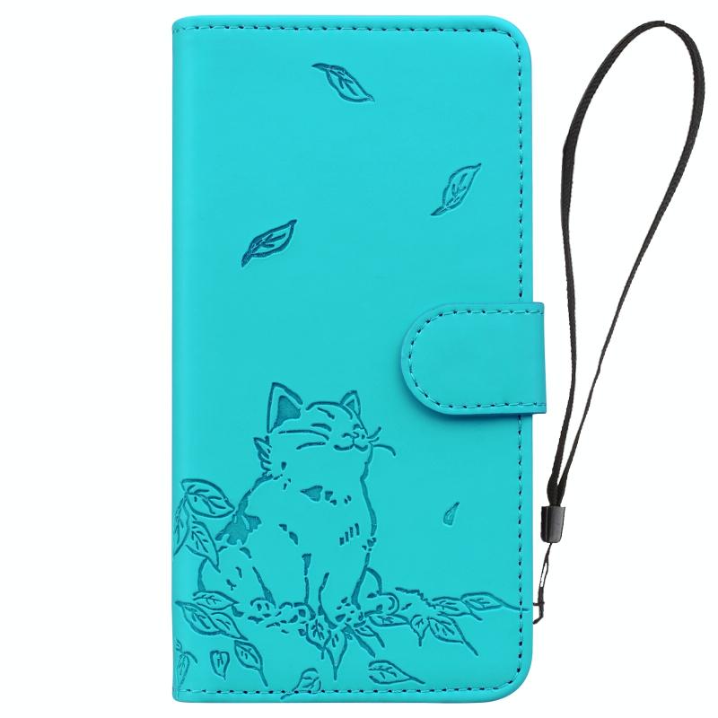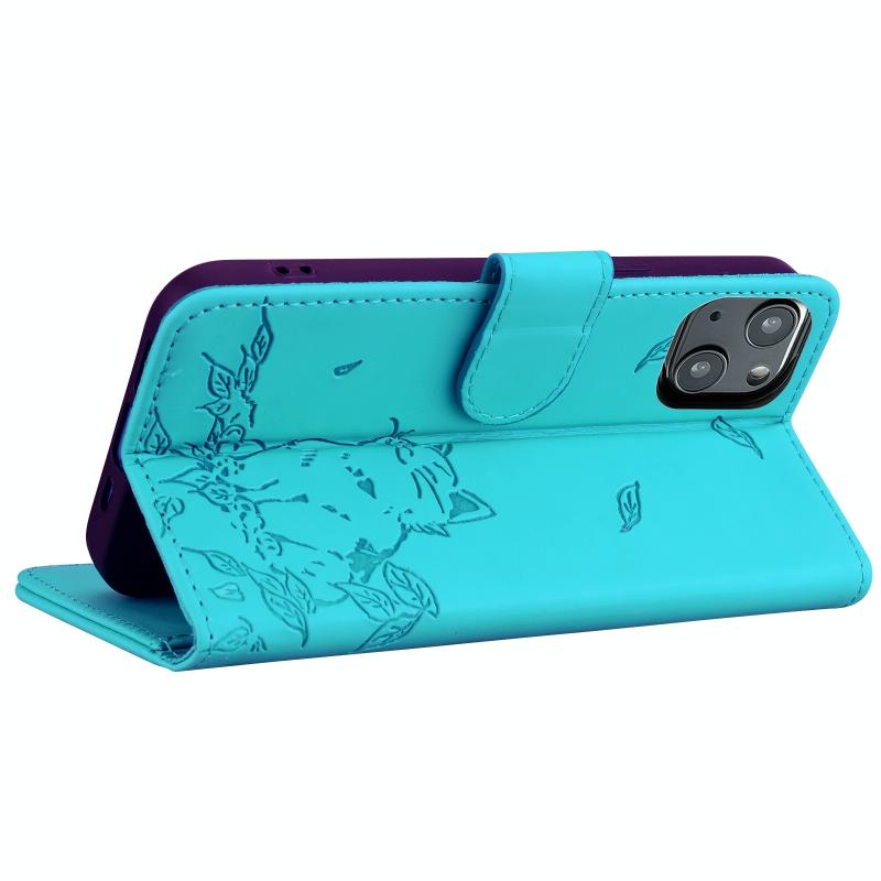 For iPhone 13 Cute Cat Embossed Leather Phone Case(Lake Blue)