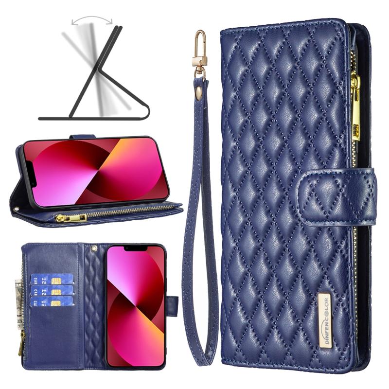 For iPhone 13 Diamond Lattice Zipper Wallet Leather Flip Phone Case(Blue)