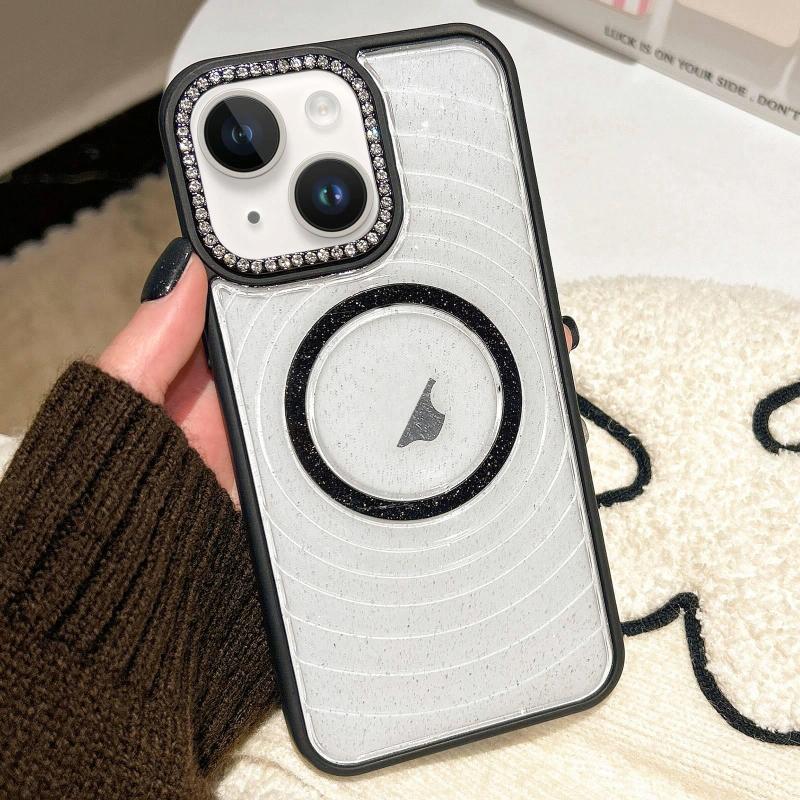 For iPhone 13 Diamond Lens Frame MagSafe Wave Texture Clear Phone Case(Black)