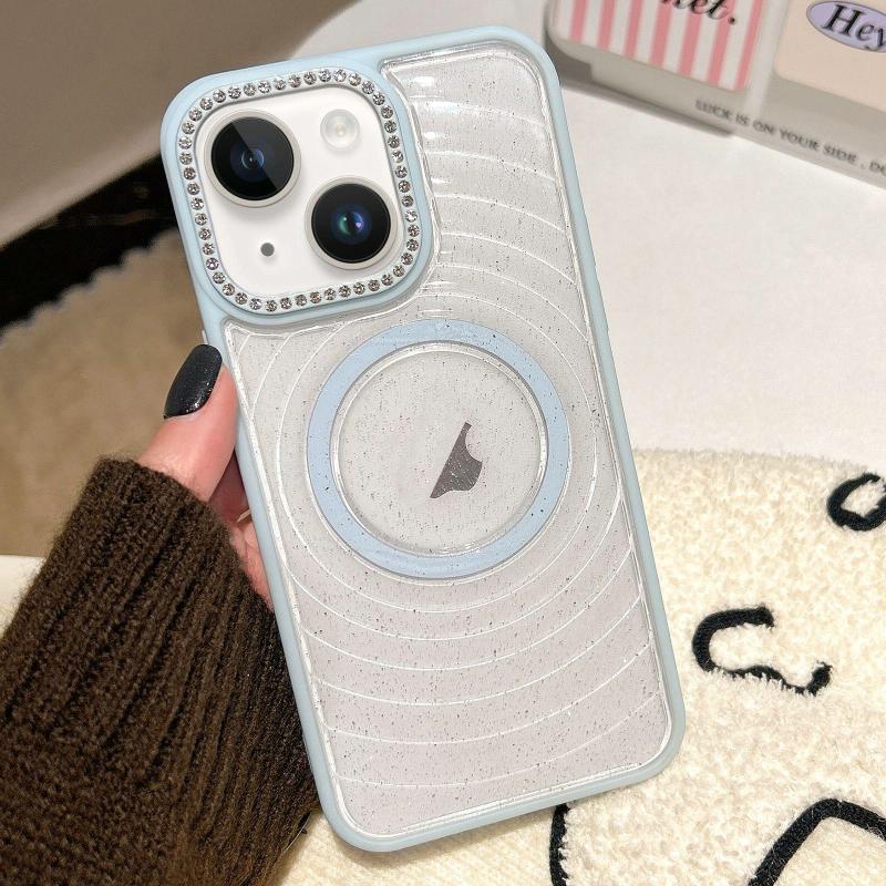 For iPhone 13 Diamond Lens Frame MagSafe Wave Texture Clear Phone Case(Blue)